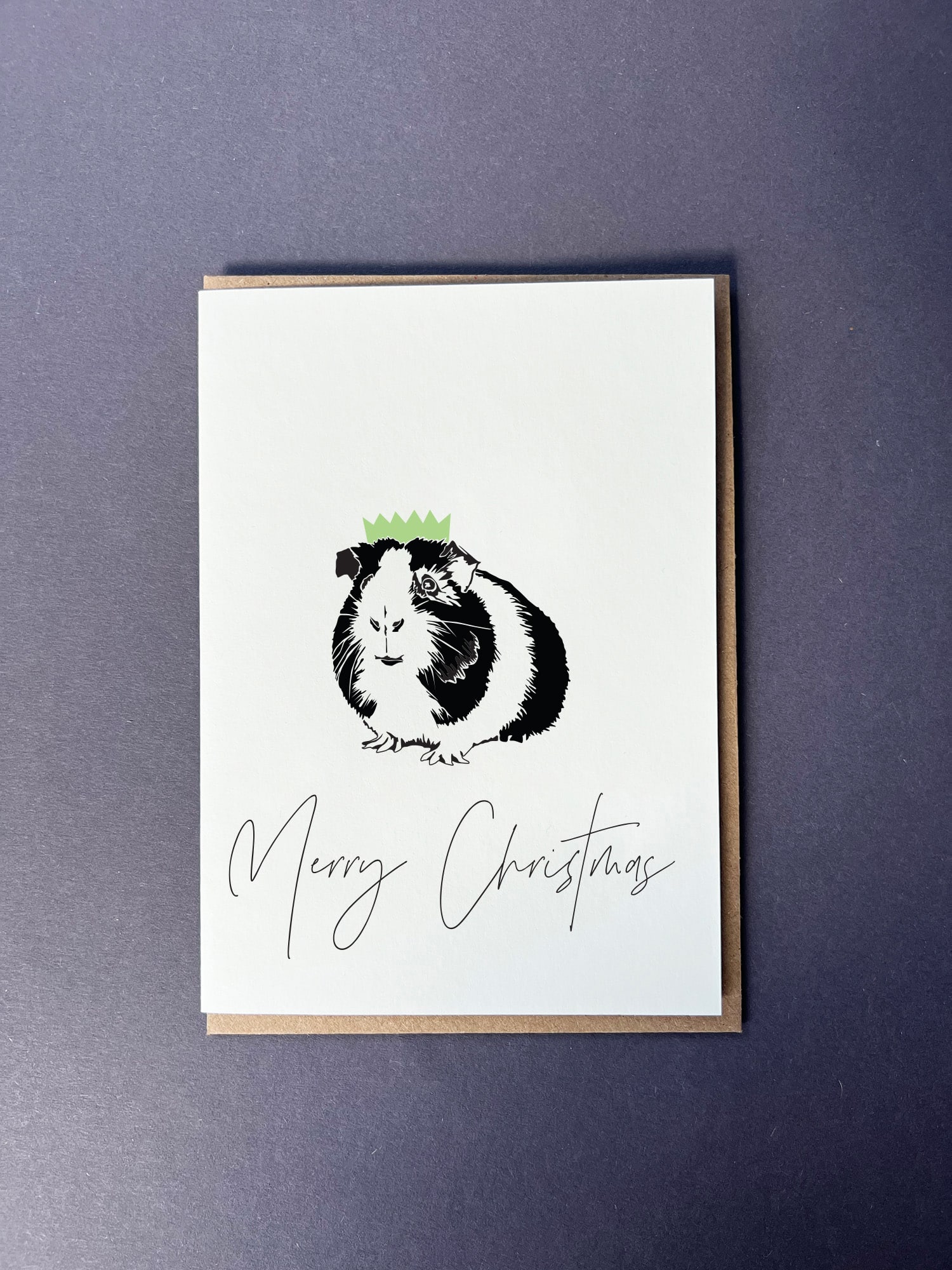 This gorgeous letterpress greetings card Christmas guinea pig is illustrated with a cute guinea pig wearing a neon cracker hat. Printed in neon lime and black, with modern calligraphy “Merry Christmas”. Perfect to send seasons greetings to any guinea pig lover.