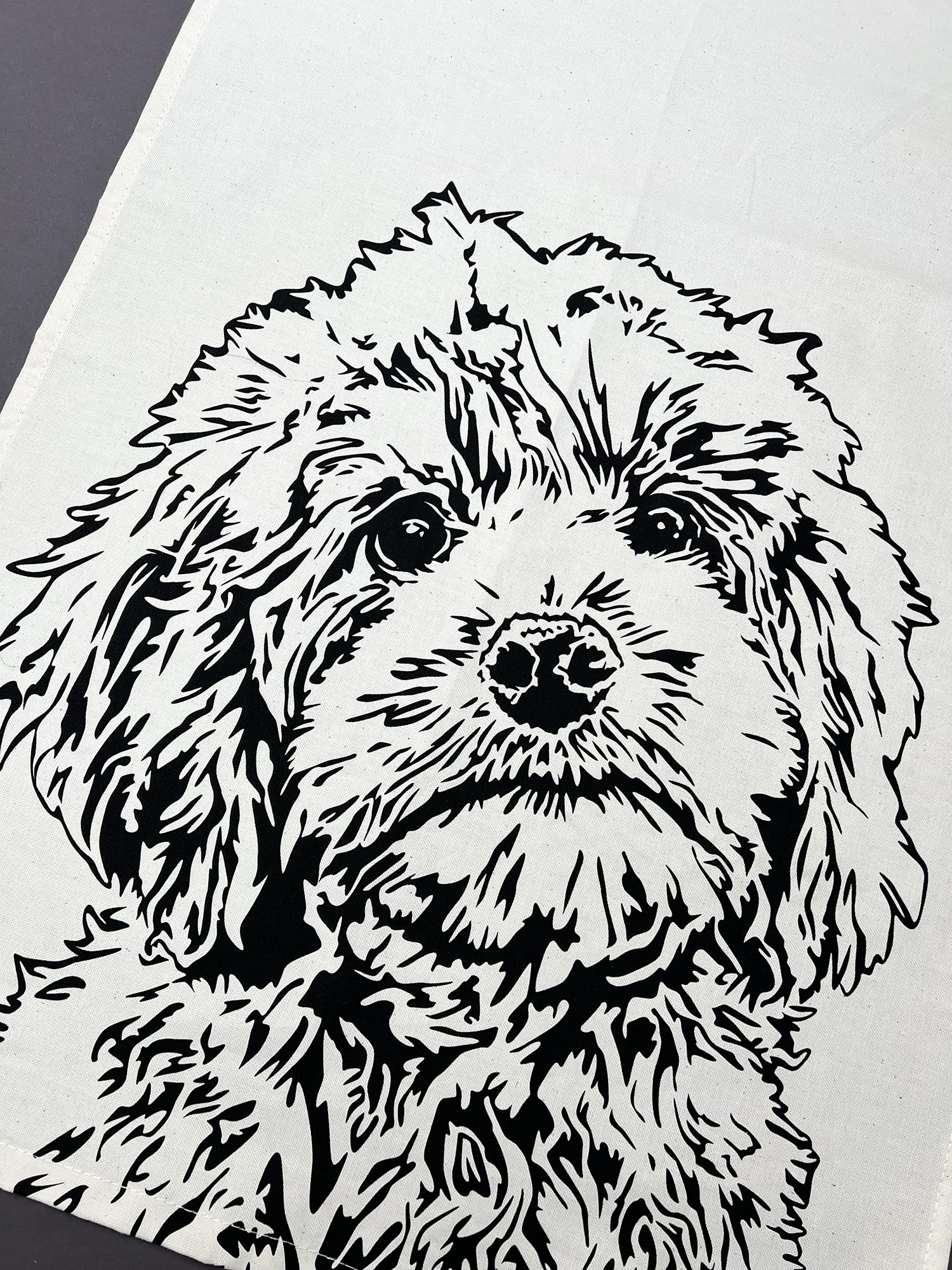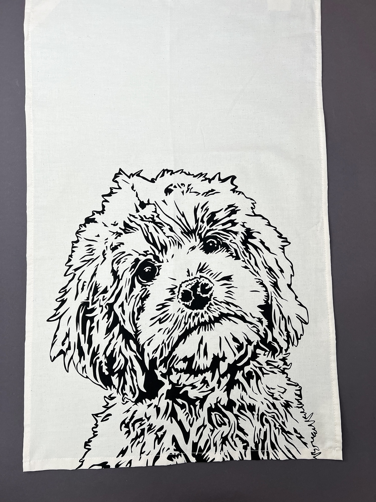 A gorgeous screen-printed cockapoo tea towel, printed with a close-up of a cockapoo puppy’s face. Who can resist those big puppy eyes? Perfect for any cockapoo lover as a housewarming, wedding, or anniversary gift. This large, unbleached cotton tea towel, is very absorbent making it great for drying up your dishes.