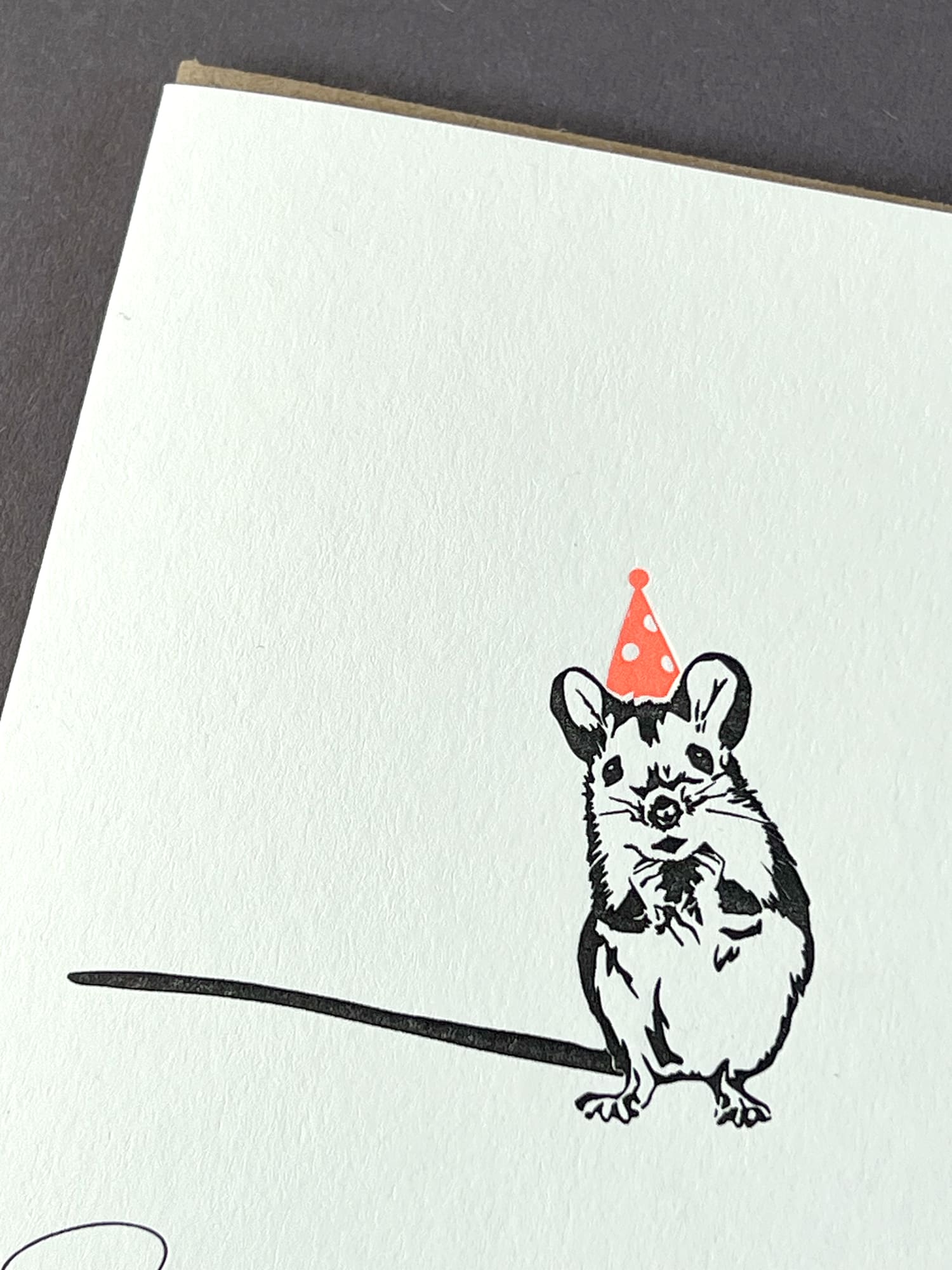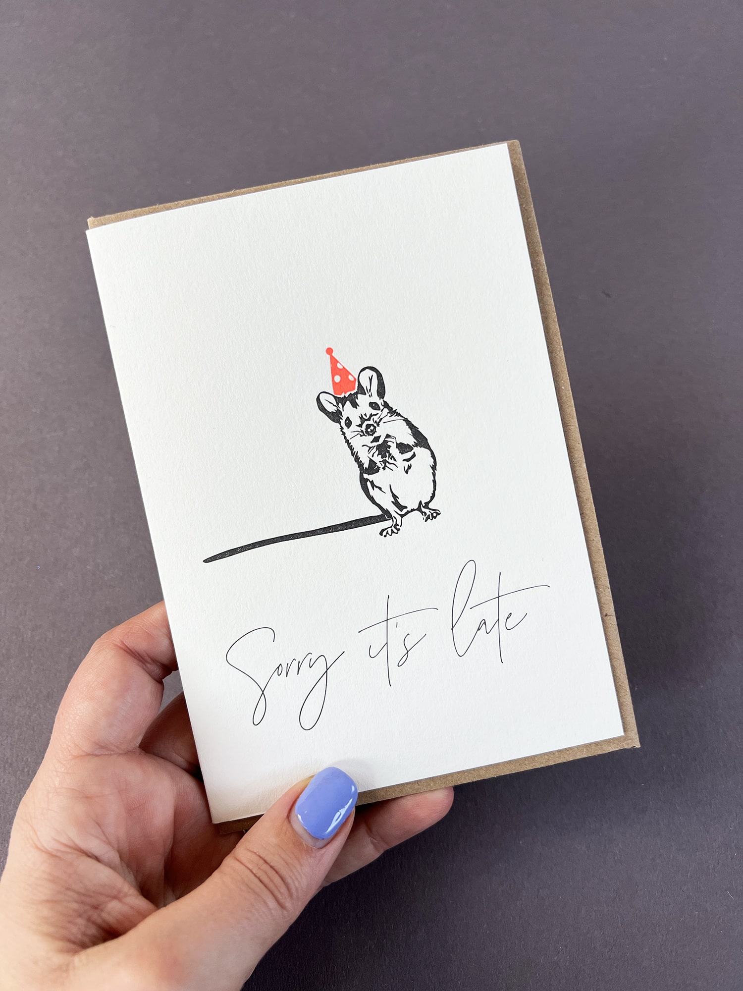 This gorgeous letterpress greeting card Late Mouse is illustrated with a cute mouse wearing a birthday hat. Printed in black and neon red, with modern calligraphy “Sorry it’s late”. Oops, forgot a friend’s birthday? This cute mouse will help get you out of trouble.