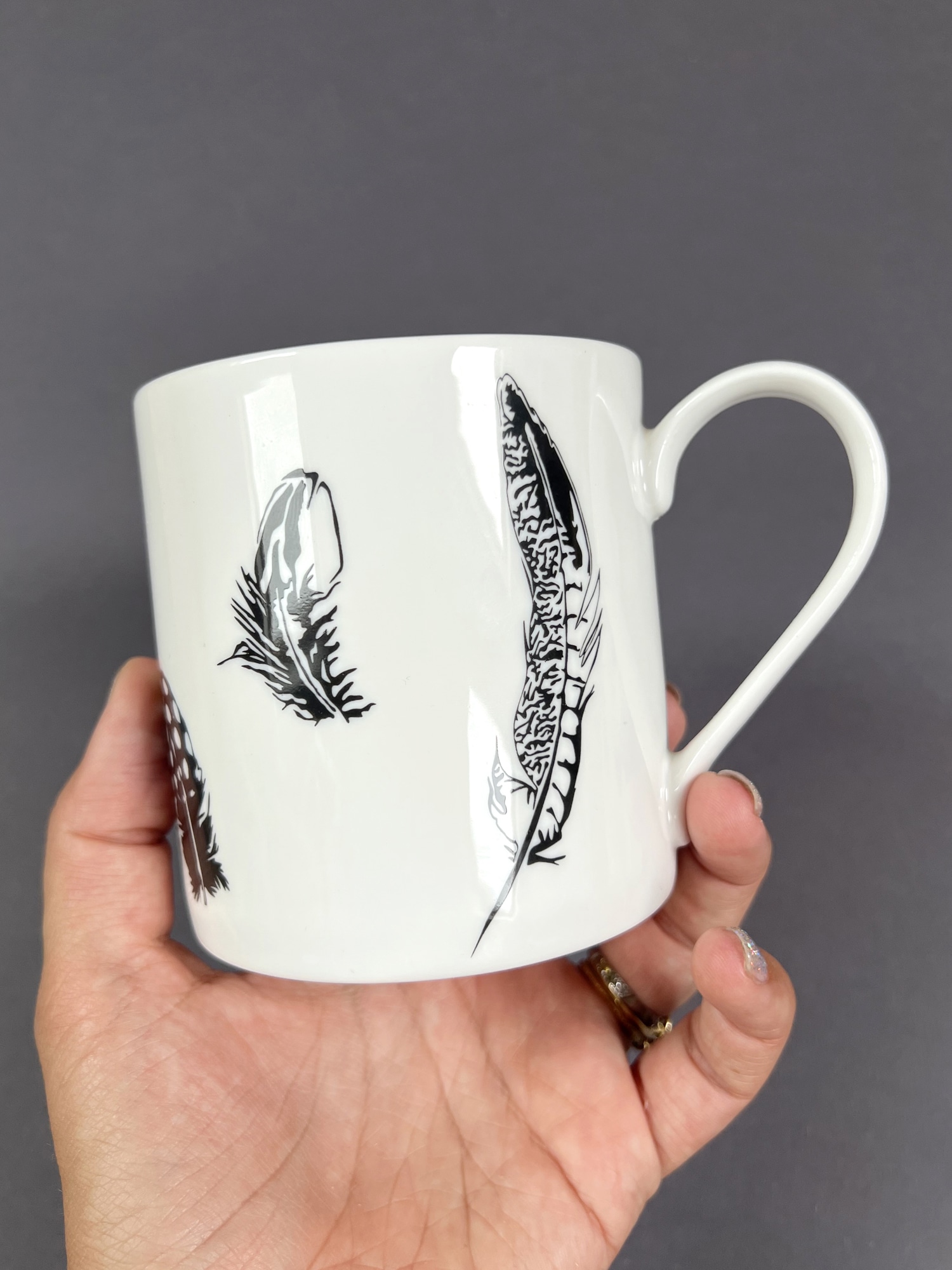 A gorgeous hand-decorated mug decorated with our favourite feathers. Featuring a Jay Feather, Tawny owl feather, and pheasant feather, with a fluffy guinea fowl feather on the inside of the mug. Perfect for any nature or bird lover as a housewarming, wedding, or anniversary gift.