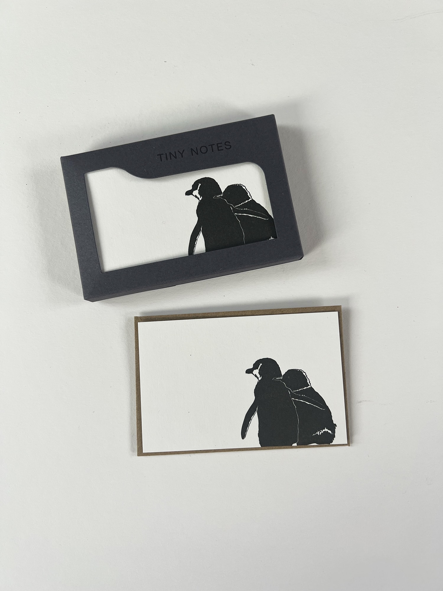 Gorgeous letterpress printed tiny notes in black illustrated with two hugging penguins presented in a little letterpress printed box with kraft envelopes. Our Tiny Note cards are small flat cards, made from the offcuts of our large cards, allowing us to reduce our waste. Perfect for little messages, thank you cards, place settings, and gift tags.