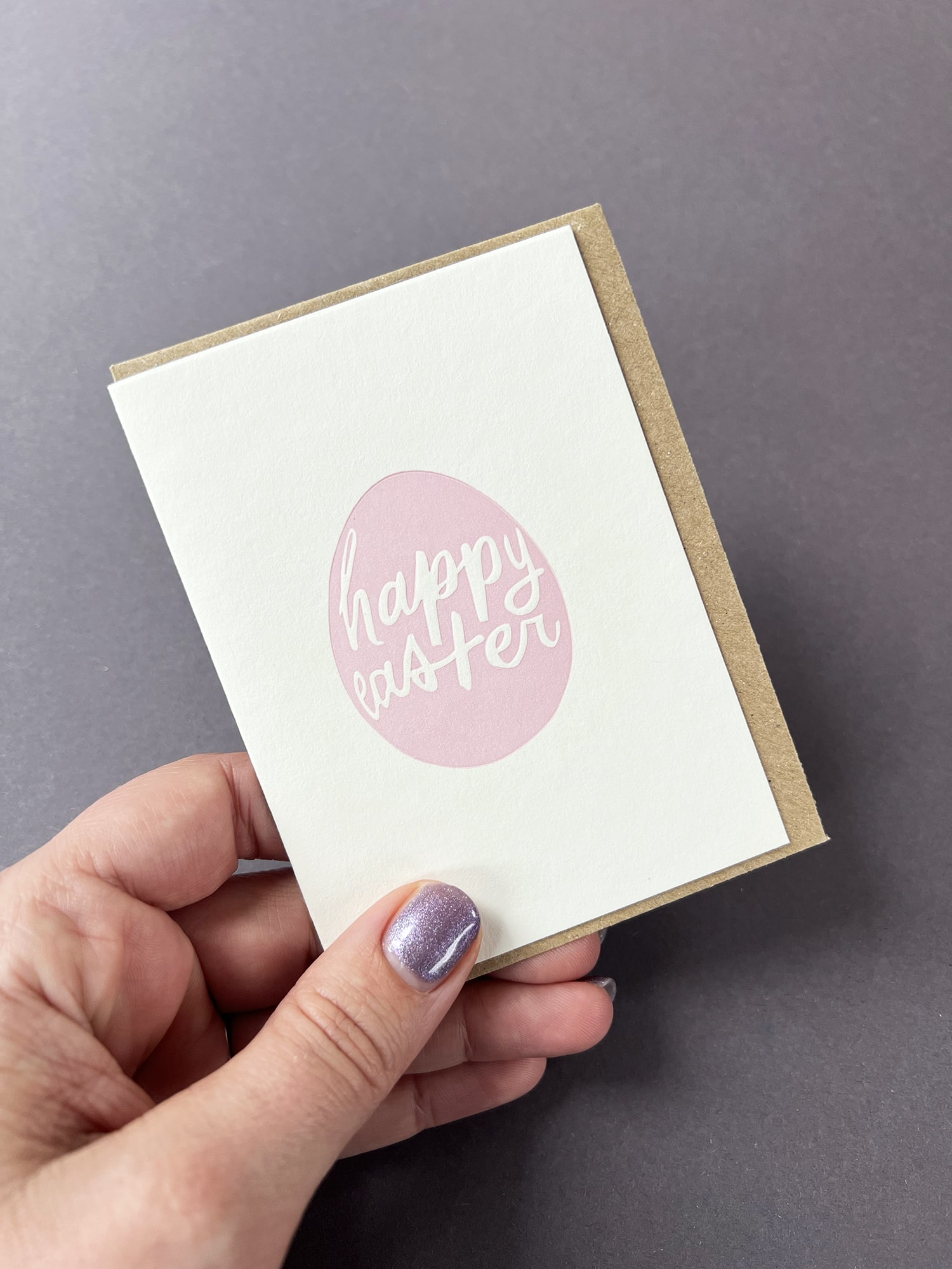 This gorgeous letterpress greetings card is illustrated with a cute Easter egg, printed in pastel pink with happy easter written across the egg. These beautiful cards are perfect to send to Easter greetings to friends and family.