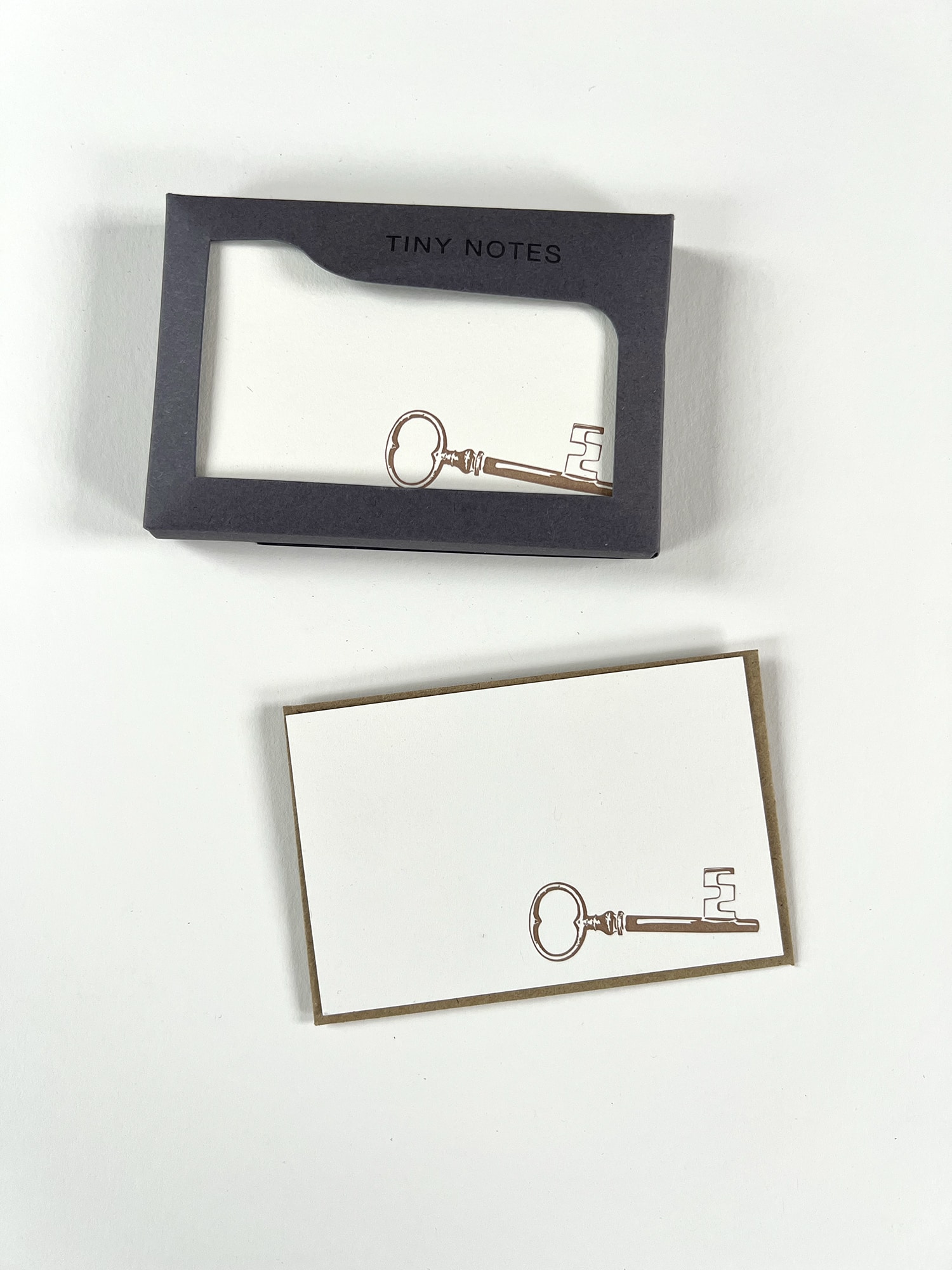 Gorgeous letterpress printed tiny notes in metallic gold illustrated with a vintage key at the bottom of the card, presented in a little letterpress printed box with kraft envelopes. Our Tiny Note cards are small flat cards, made from the offcuts of our large cards, allowing us to reduce our waste. Perfect for little messages, thank you cards, place settings, and gift tags.